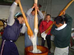 客家麻糬的製作極富趣味,除了由原木雕制而成的臼外,更需由遊客自行努力用木杵搗制而成,享用時除了品嘗自己努力的成果外,並可體會過程中的趣味哦 |